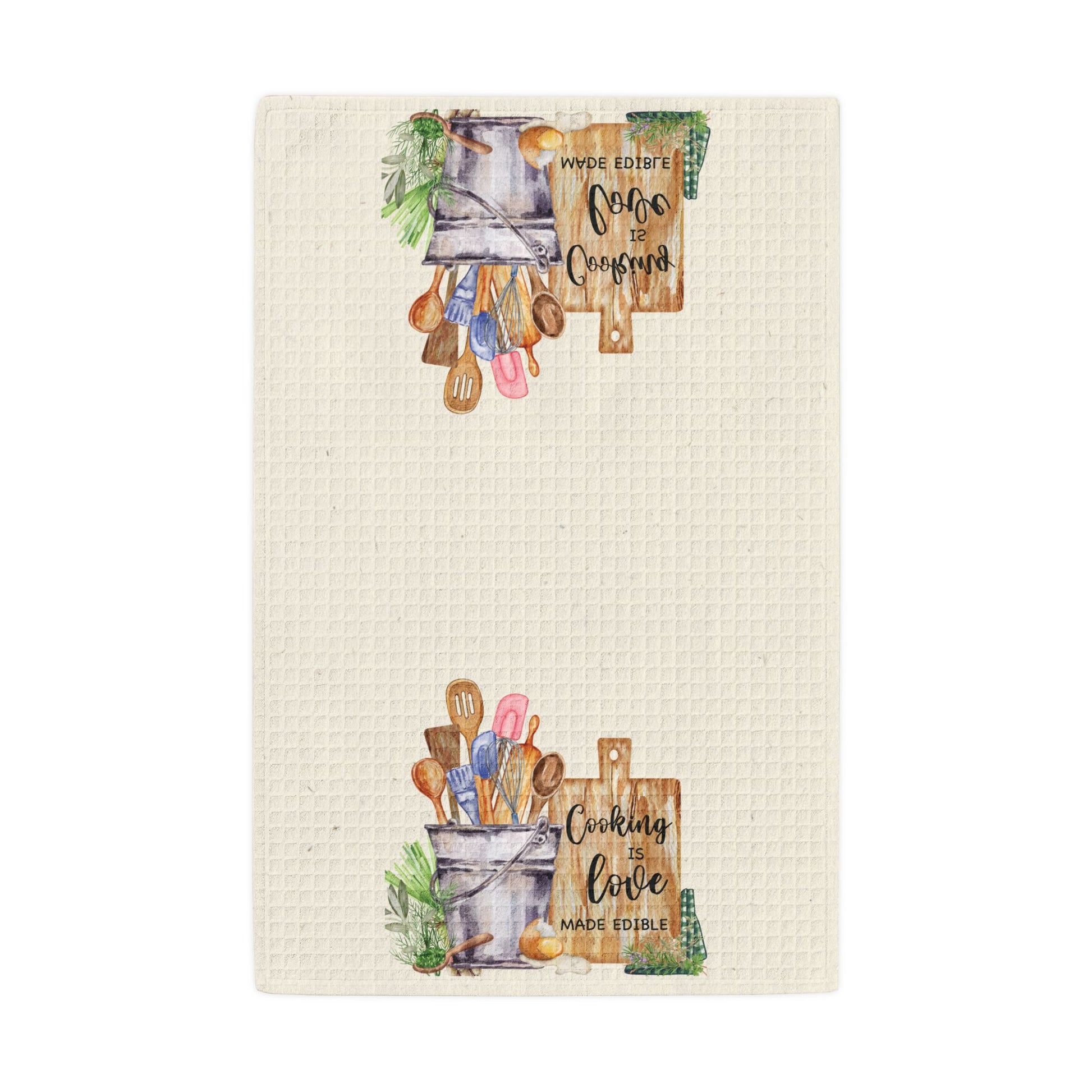 A waffle weave kitchen towel designed for herb-filled mornings, garden harvests, and kitchens where cooking is love made edible.