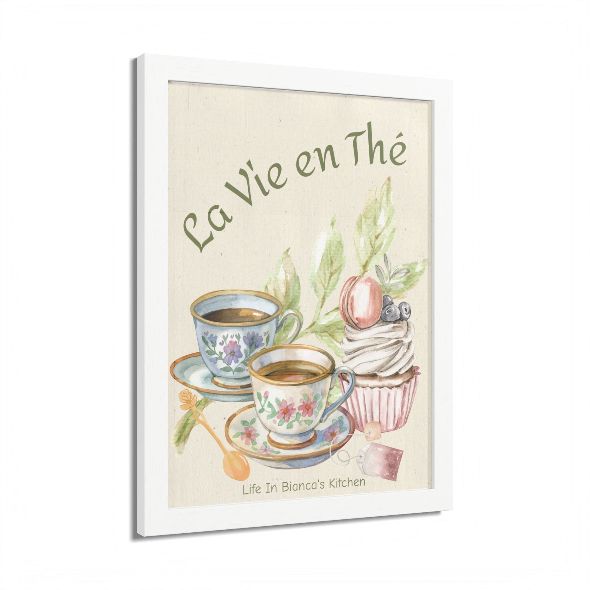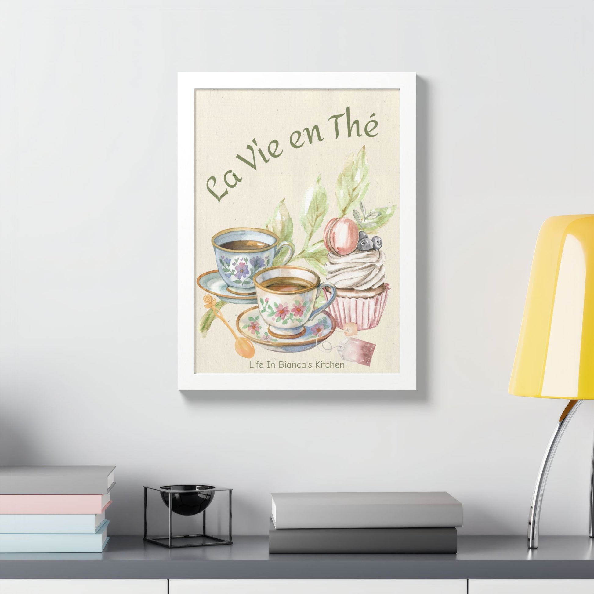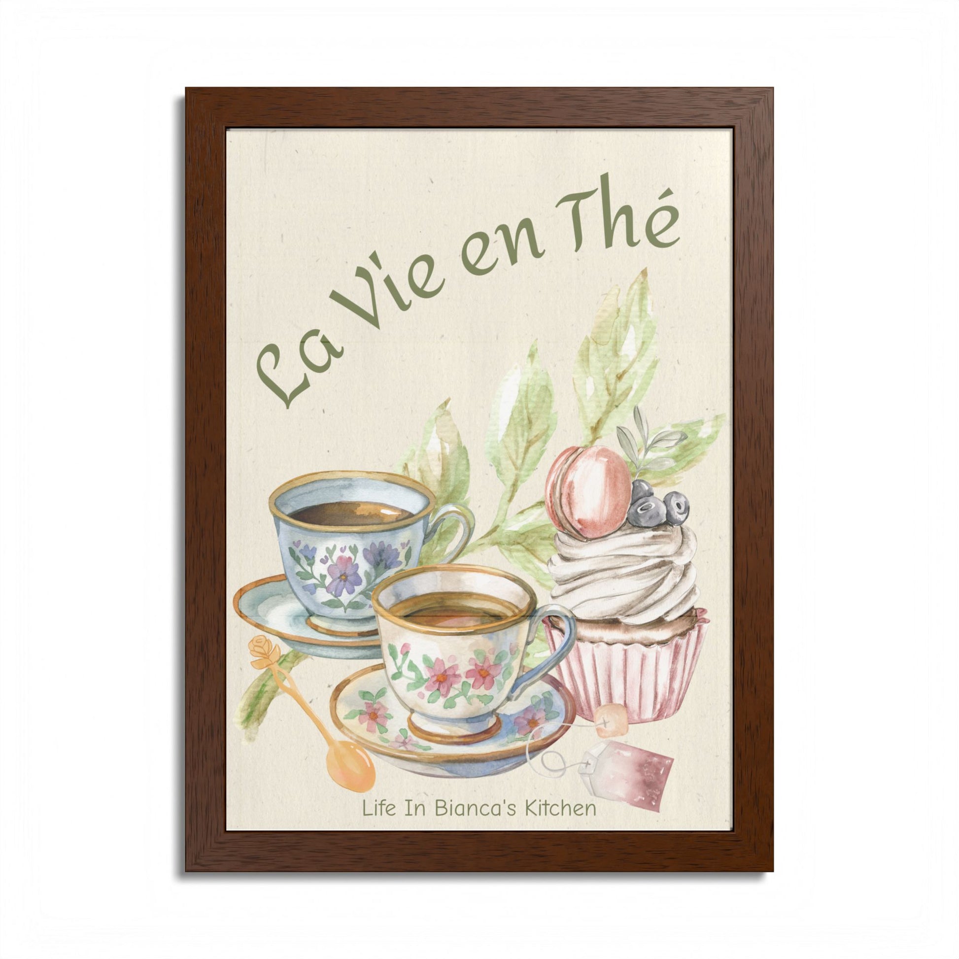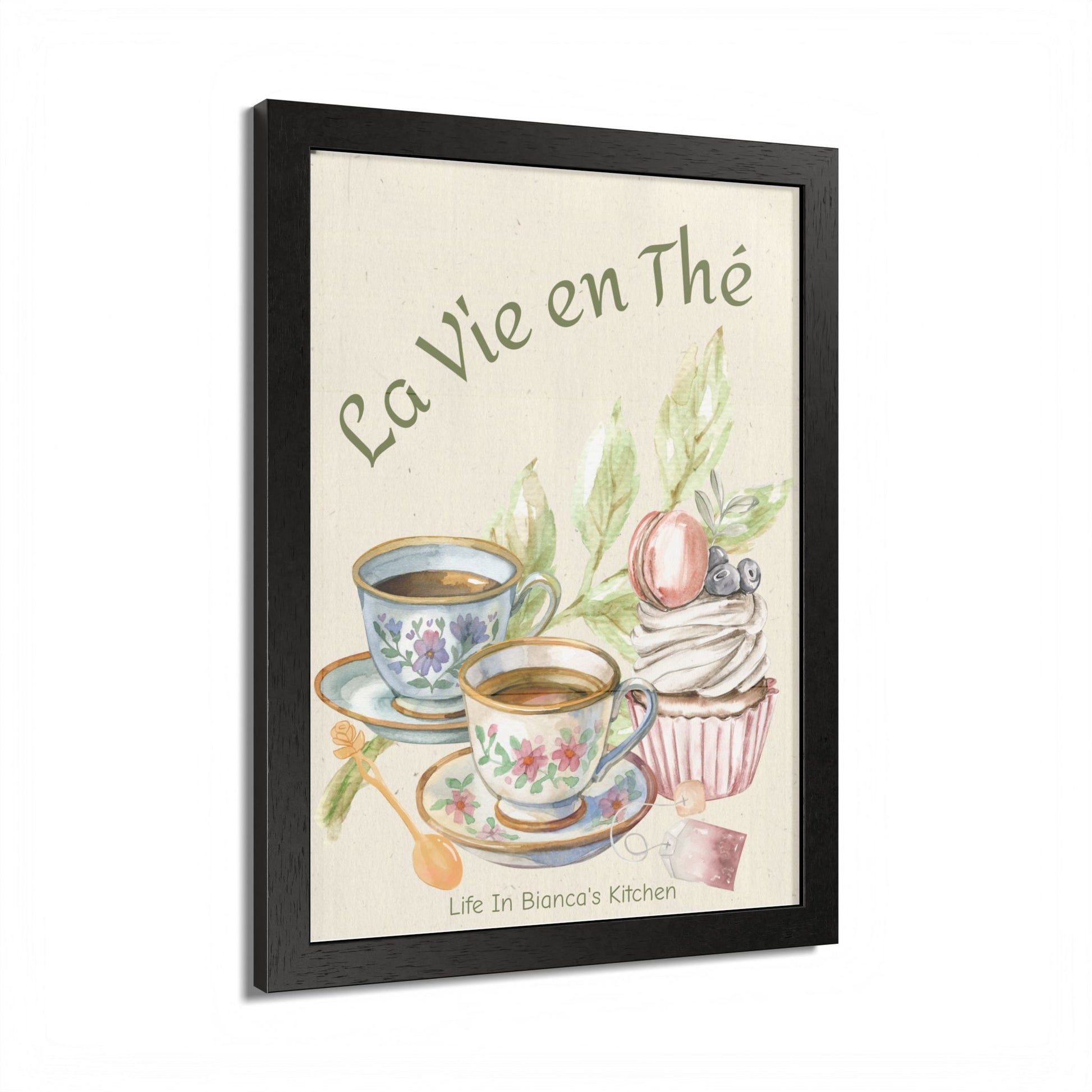Printed as a framed art piece, this design pairs beautifully with the pieces from the La Vie en Thé Collection, including the illustrated mug, apron, and kitchen towel.